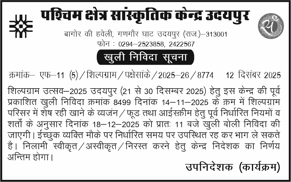 Home/Latest News/शिल्पग्राम उत्सव 2025 हेतु शेष बची स्टॉलों की खुली निलामी Latest NewsShilpgramShilpgram UdaipurTenders & NotificationWhat's new शिल्पग्राम उत्सव 2025 हेतु शेष बची स्टॉलों की खुली निलामी Tweet