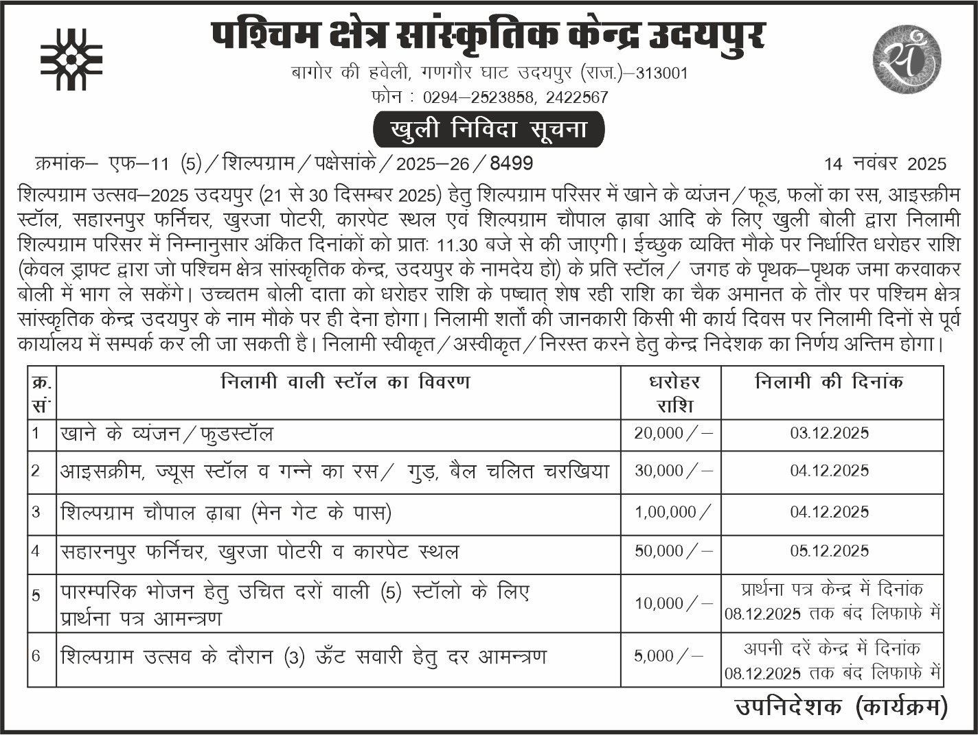 Home/Tenders & Notification/शिल्पग्राम परिसर में खाने के व्यजंन / फूड, आइस्क्रीम, सहारनपुर फर्निचर, खुरजा पोटरी, कारपेट एवं शिल्पग्राम चौपाल ढ़ाबा आदि स्टॉल Tenders & Notification शिल्पग्राम परिसर में खाने के व्यजंन / फूड, आइस्क्रीम, सहारनपुर फर्निचर, खुरजा पोटरी, कारपेट एवं शिल्पग्राम चौपाल ढ़ाबा आदि स्टॉल Tweet