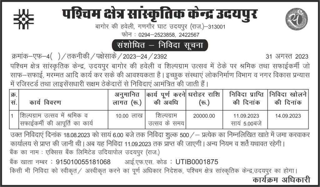 Home/Latest News/Sansodhit Nivida Suhchana Latest NewsShilpgramShilpgram UdaipurTenders & NotificationWhat's new Sansodhit Nivida Suhchana Supply of workers and sweepers in Shilpgram Utsav Tweet